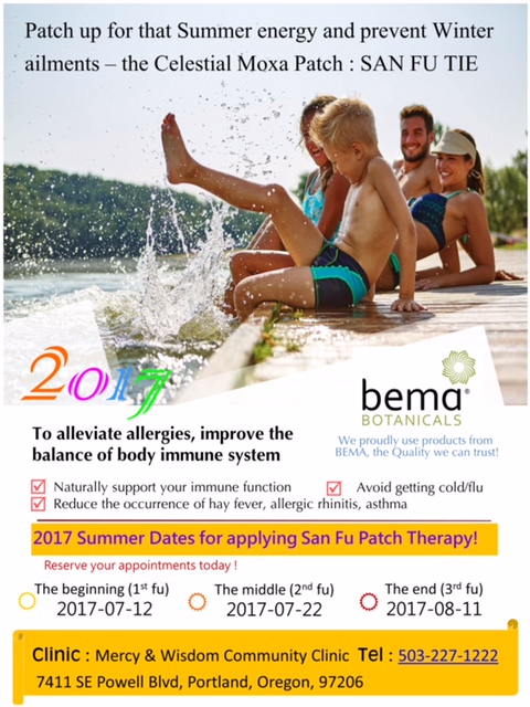 San Fu Patch Therapy for immune support, alleviate allergies, lung problems and heart health.  This Chinese acupuncture treatment can help with many diseases. Referred to in China as “Winter Disease Point Sticking” , is the application of effective herbal medicines to make into a paste that is sticking to the back of body points to treat the symptoms of a recurring or worsening chronic, respiratory diseases and pollen allergy. Because the dog days are the httest time of the year and the highest point of yang in the human body, the medicine can run very will in the hot weather.